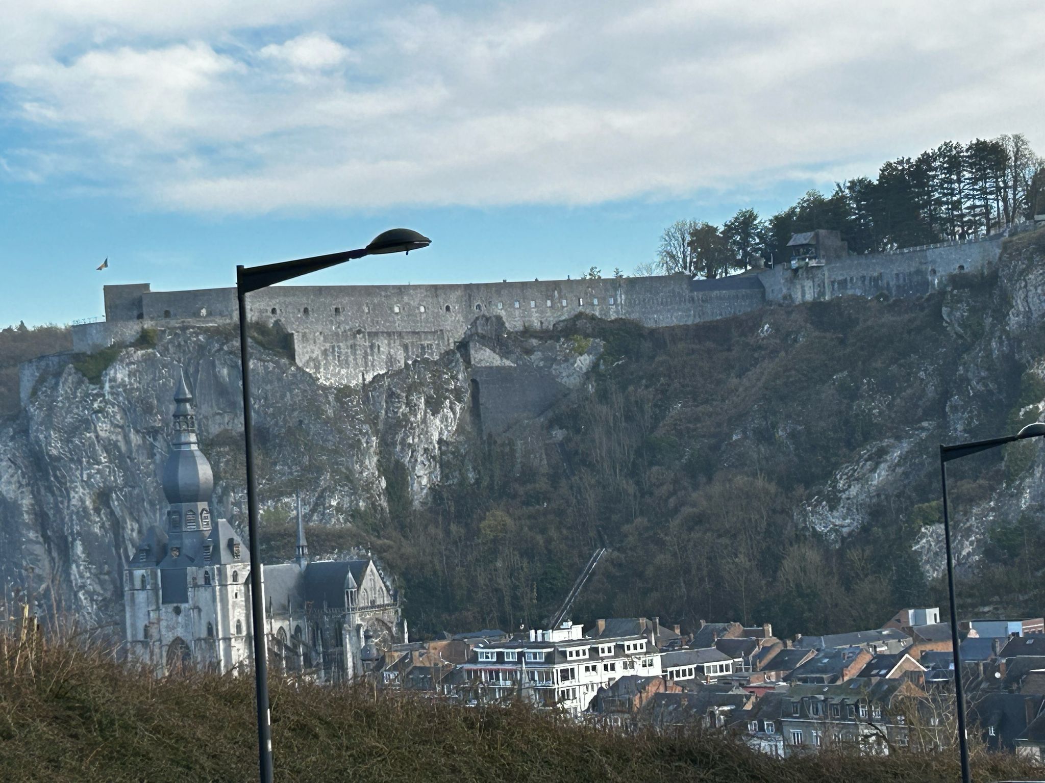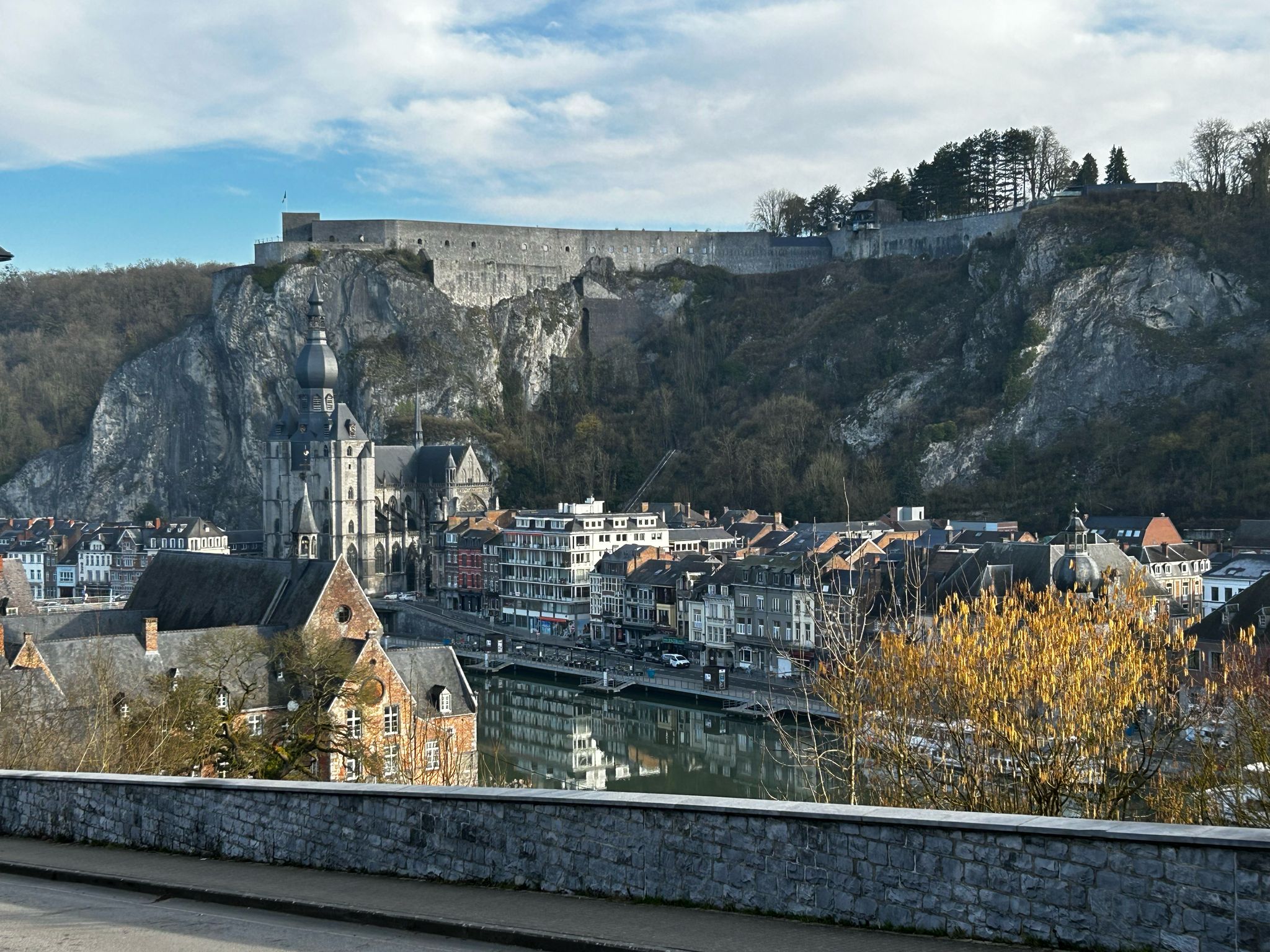 Dinant is een prachtige vestigingstad aan dr Maas met mooie kasteelmuur bovenaan de steilwand en een mooi kasteel. Langs de Maas naar Frankrijk gereden, heel mooi met landgoederen en mooie reflectie in het water.
