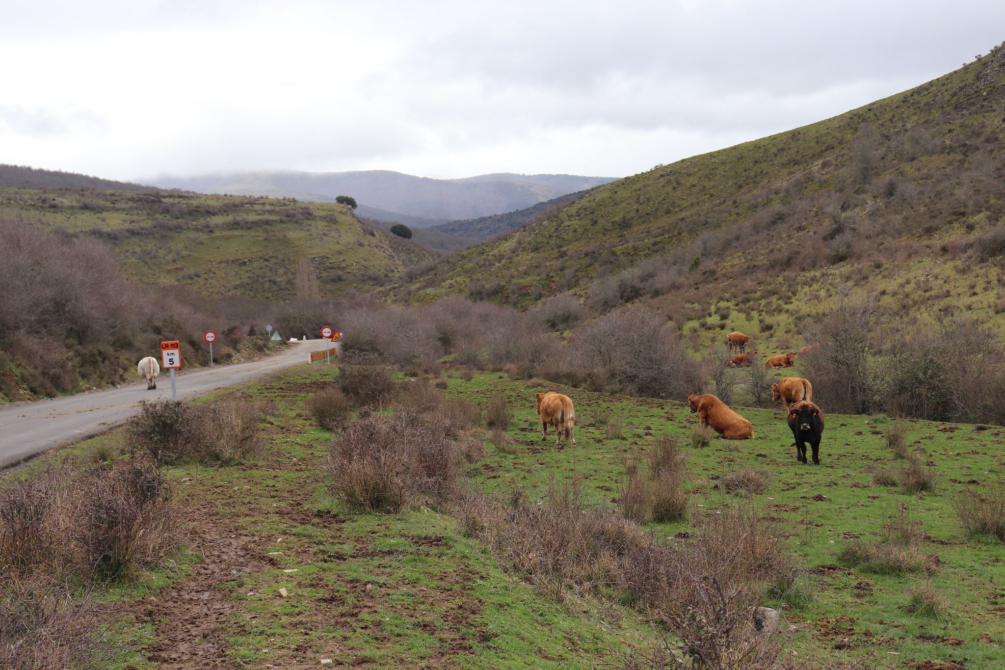 O ja, de hond is een van de vele schaapshonden die we zien die de kuddes beschermen. Maar deze stond ergens moederziel alleen en was heeel mager.