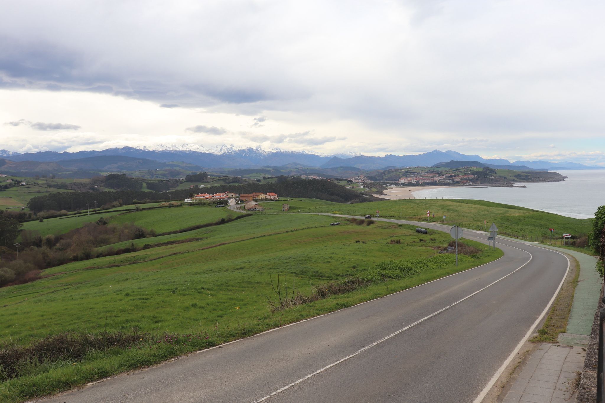 Vervolgens kregen we bij San Barqueras zicht op de volgende bestemming: Picos Europa. Heel vreemd om in 1 shot een oceaanstrand, weide met grazende koeien en besneeuwde 2500 toppen te krijgen.